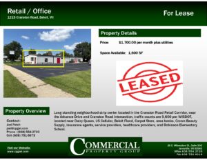 Commercial Property Group recently leased out 5500 square feet of space to a local entrepreneur at 2950 Prairie Avenue in Beloit for an event center. Plans are to be open before the upcoming holiday season.